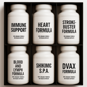 | 1 | Blood & Lymphatic Formula | Purifies blood; mobilizes jab-borne debris | Yellow Dock • Burdock • Dandelion • Nettle • Alfalfa • Chickweed • Red Clover • Cleavers • Kali Musli • Turmeric • Cayenne • Manjistha • Echinacea • Oregon Grape • Cyathula • Goldenseal |